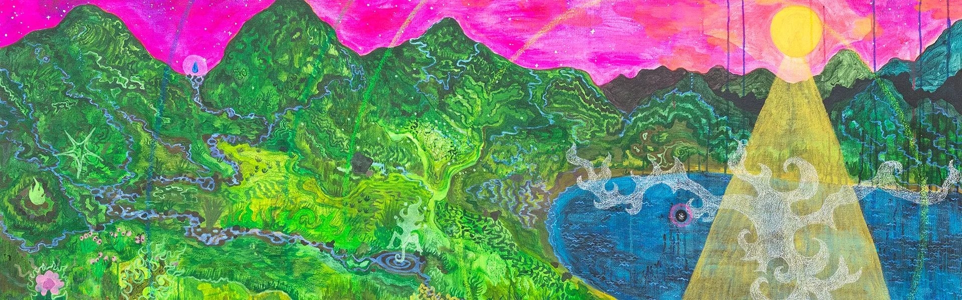 Acrylic, oil pastel, interference paint, fixative on canvas